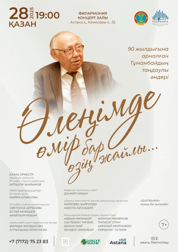 Астана қаласының Еркеғали Рахмадиев атындағы мемлекеттік академиялық филармониясы қазақ поэзиясының аса көрнекті өкілі, Қазақстанның халық ақыны Тұманбай Молдағалиевтің 90 жылдығына арналған «Өлеңімде өмір бар өзің жайлы…» атты мерекелік концертке шақырады.