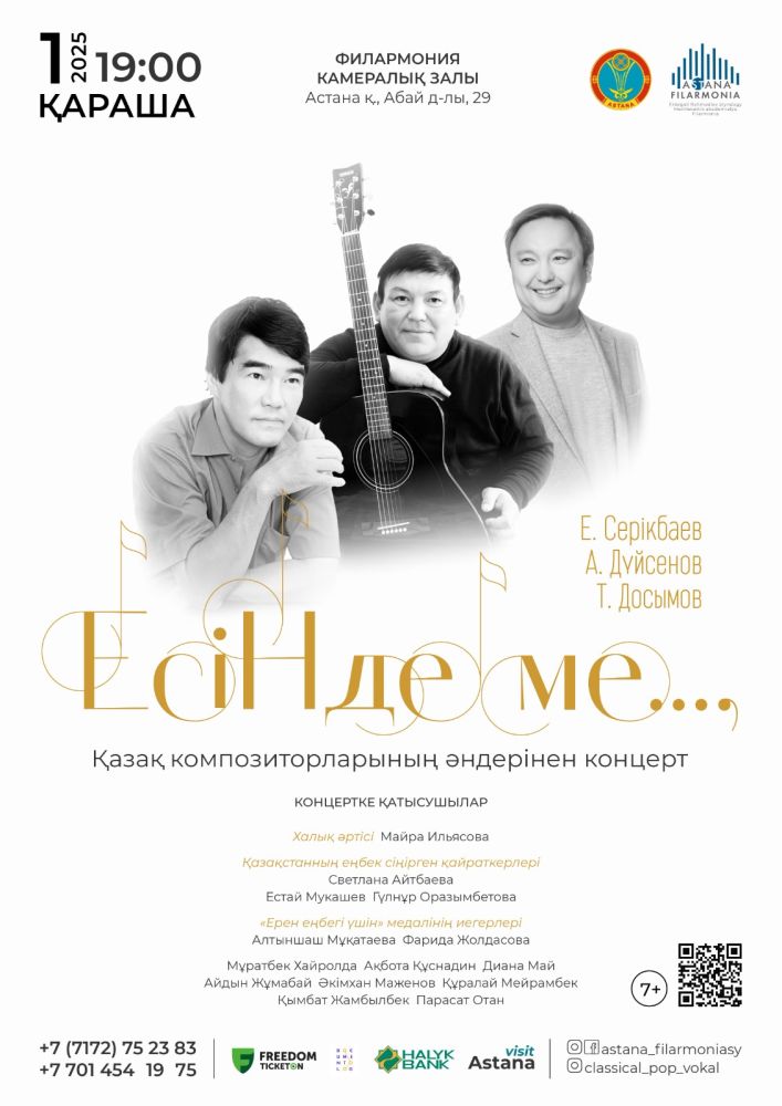Астана қаласының Еркеғали Рахмадиев атындағы мемлекеттік академиялық филармониясы қазақ композиторларының әндеріне арналған «Есіңде ме…» атты концертке шақырады.
