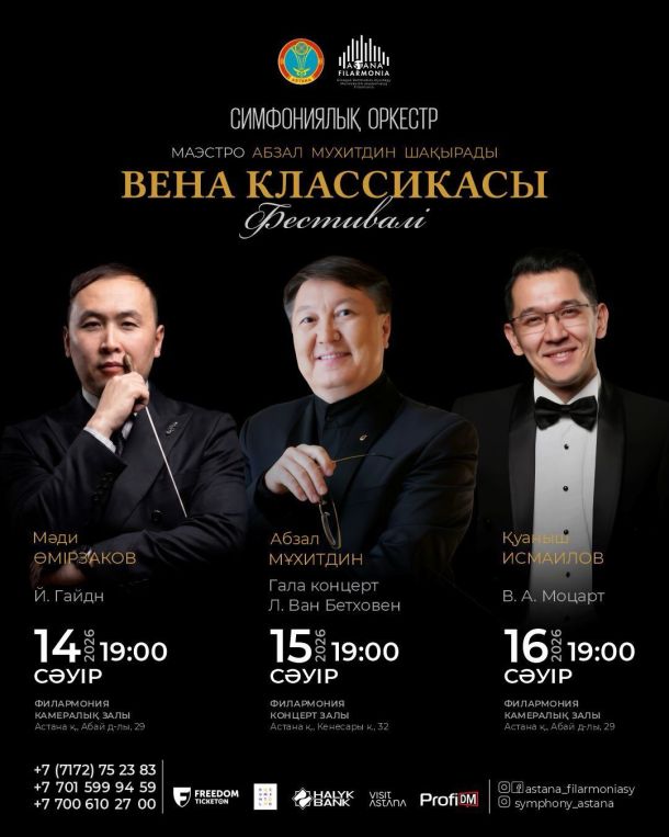С 14 по 16 апреля в столице состоится фестиваль классической музыки «Маэстро Абзал Мухитдин шақырады», посвящённый шедеврам венской классической школы. В течение трёх дней на концертных площадках филармонии г. Астаны прозвучат произведения трёх величайших композиторов мировой музыкальной культуры - Йозеф Гайдна, Вольфганга Амадея Моцарта и Людвига ван Бетховена.
